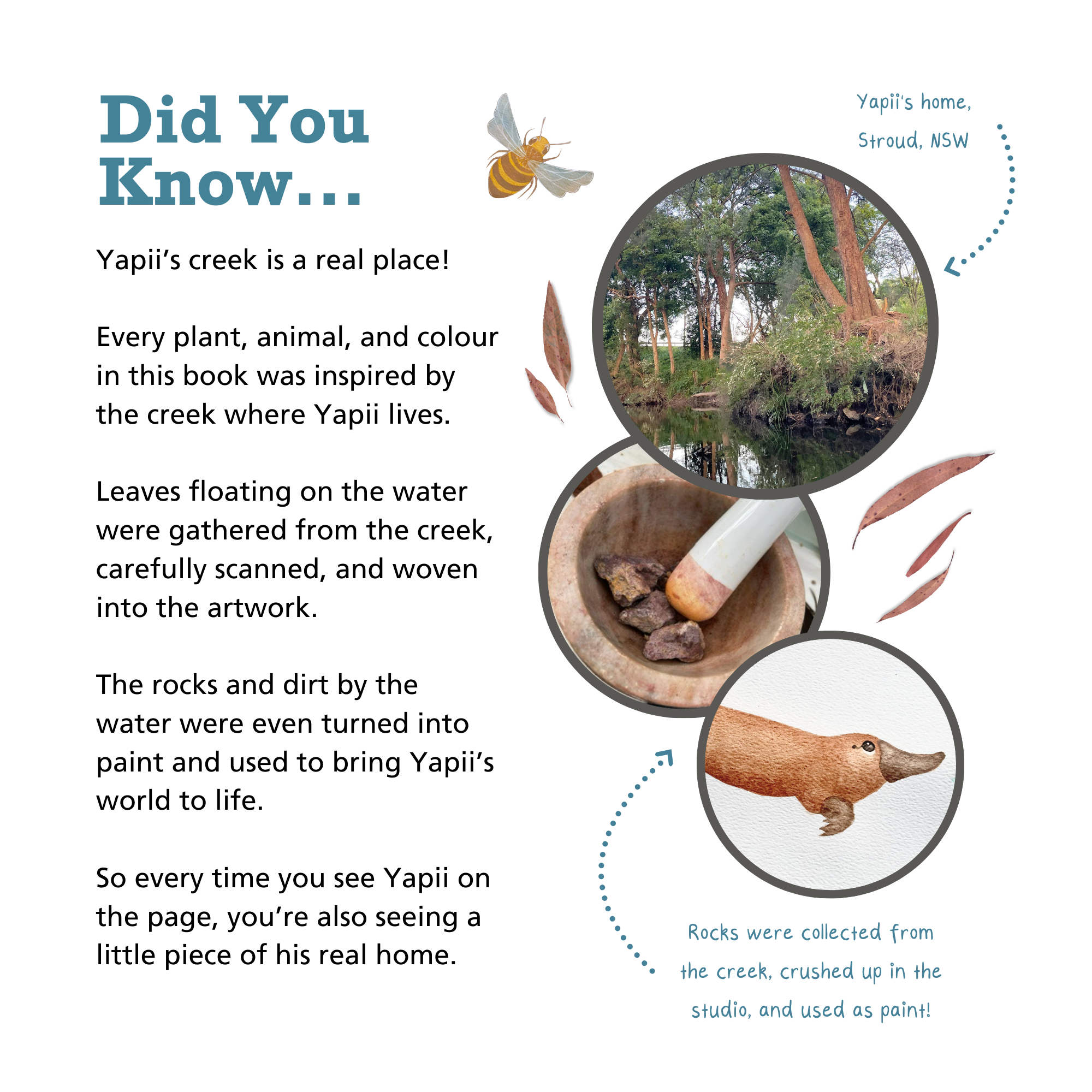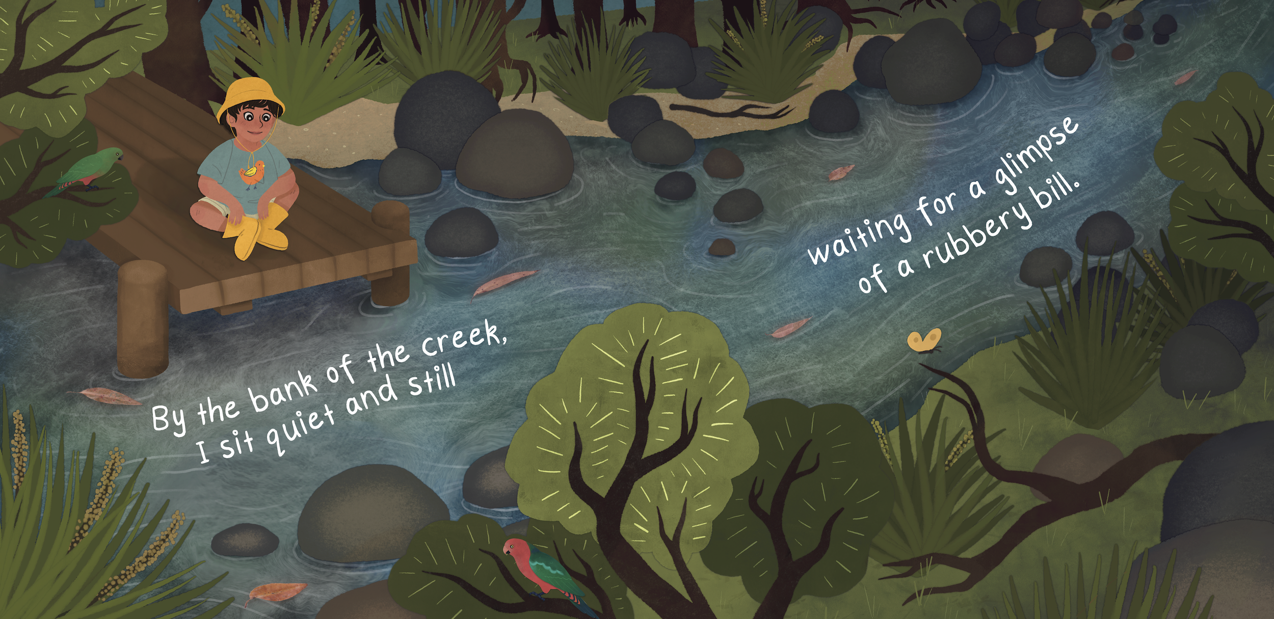 Set on Worimi Country, the story invites children to sit quietly on the creek bank, observing shimmering ripples and hidden bushland creatures. Their patience is rewarded with an unforgettable encounter with Yapii the platypus.
